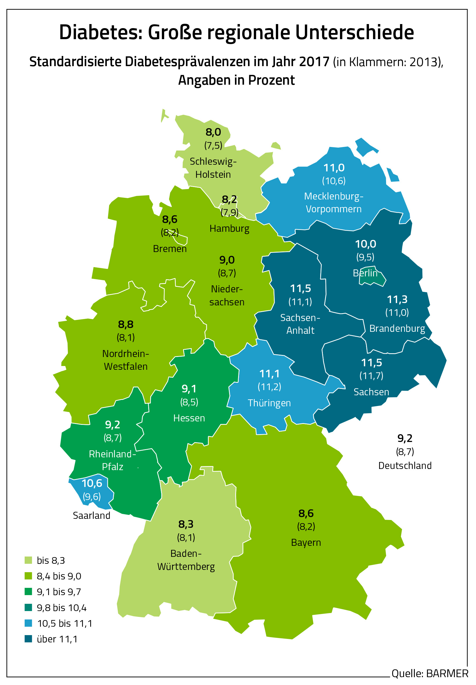 Laut „Diabetes-Atlas“ gab es im Jahr 2017 die höchsten Diabetesraten in Sachsen und Sachsen-Anhalt mit jeweils 11,5 Prozent, Brandenburg (11,3 Prozent), Thüringen (11,1 Prozent) und Mecklenburg-Vorpommern (elf Prozent). Die geringsten Quoten lagen in Schleswig-Holstein (acht Prozent) und Hamburg (8,2 Prozent) vor. „Die regionalen Schwankungen bei den Diabetesraten sind nicht auf unterschiedliche Alters- oder Geschlechtsstrukturen zurückführen“, so Straub. Allerdings könne man in den letzten fünf Jahren eine positive Entwicklung in Sachsen und Thüringen beobachten. Dort sei die Quote um je 0,2 Prozent gesunken, während andernorts die Betroffenenraten moderat gestiegen seien.